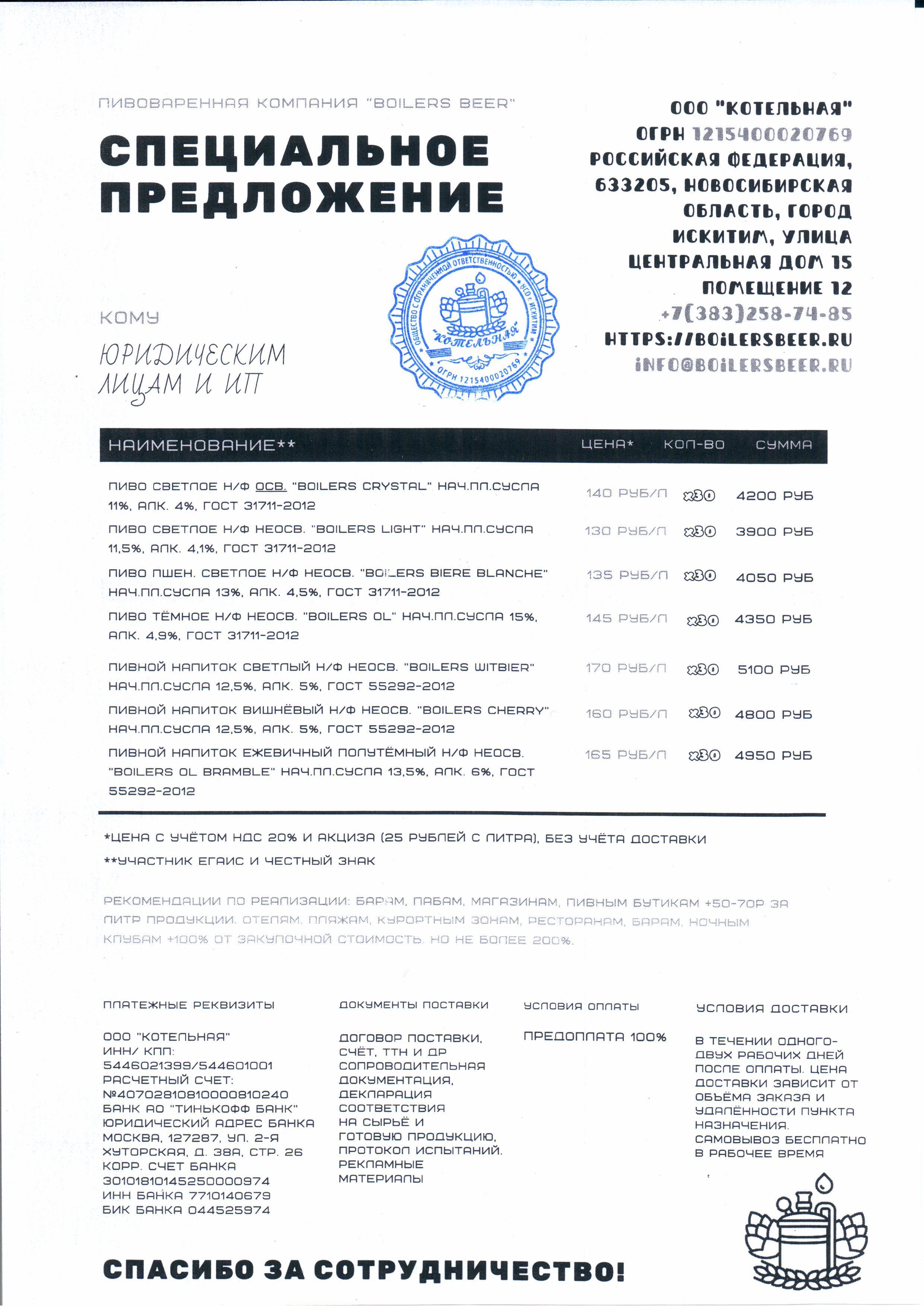 В продаже у общества с ограниченной ответственностью "КОТЕЛЬНАЯ" есть светлый пшеничный эль "Boilers BIERE BLANCHE" — "БОЙЛЕРС БИР БЛАНШ". Оптимальная цена. Поставки оптовыми партиями по территории России.
