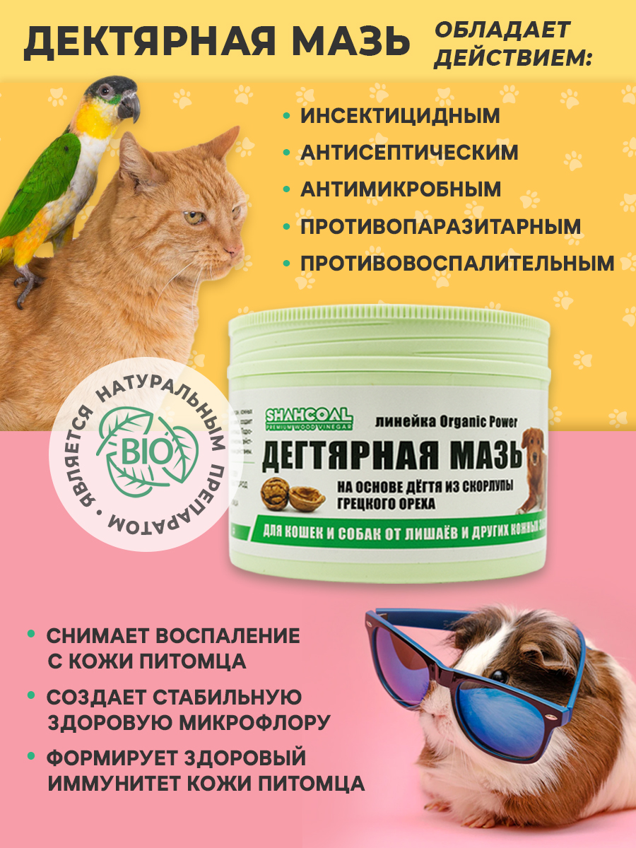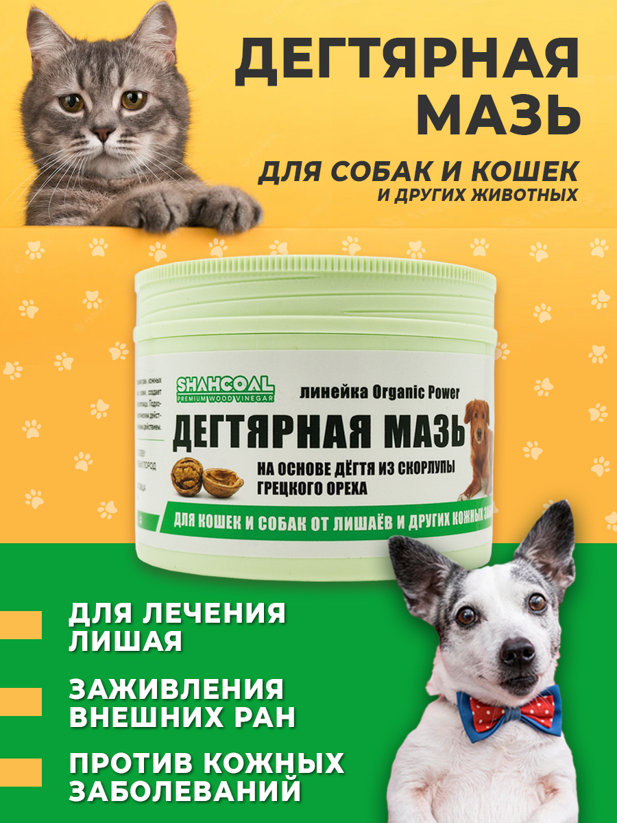 Дегтярная мазь на основе скорлупы орехов – средство для лечения лишая, внешних ран, кожных заболеваний собак и кошек и других животных. Снимает воспаление с кожи, создает стабильную здоровую микрофлору, формирует здоровый иммунитет кожи питомца. Подходит для кошек и собак любого возраста.