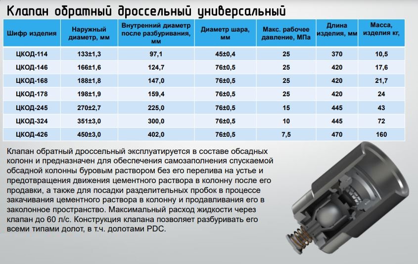 Клапан обратный дроссельный эксплуатируется в составе обсадных колонн и предназначен для обеспечения самозаполнения спускаемой обсадной колонны буровым раствором без его перелива на устье и предотвращения движения цементного раствора в колонну после его продавки, а также для посадки разделительных пробок в процессе закачивания цементного раствора в колонну и продавливания его в заколонное пространство. Максимальный расход жидкости через клапан до 60 л/с. Конструкция клапана позволяет разбуривать его всеми типами долот, в т.ч. долотами PDC.