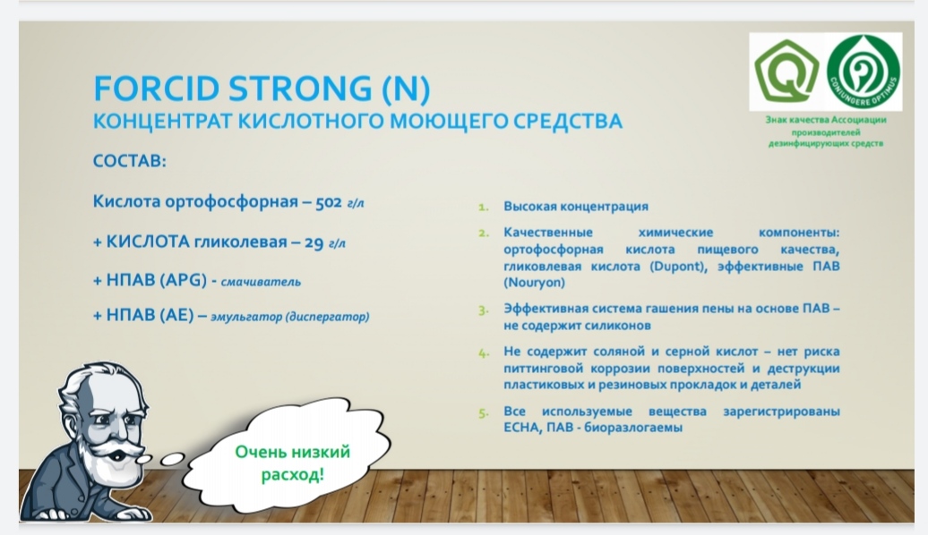 Средство обладает хорошими смачивающими и очищающими свойствами. Усиленная способность удаления окислов металлов. Средство не содержит соляную кислоту, поэтому может использоваться для очистки поверхностей из нержавеющей стали. Оптимальная температура рабочих растворов средства (25-55)°С. Концентрация рабочих растворов от 0,5%. Отличный экологический профиль.
