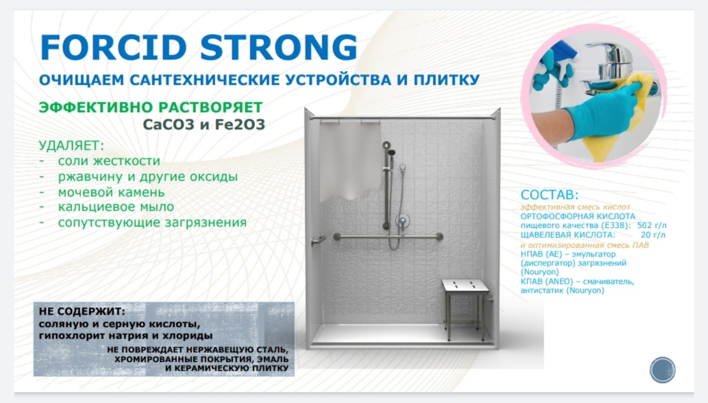 Средство чистящее «FORCID Strong» [F1] (далее по тексту – средство) -высококонцентрированное кислотное средство. Пенное. Номинальное содержание кислоты в пересчете на H3PO4– 40%. Изготавливается по ТУ BY 690653434.003-2011.