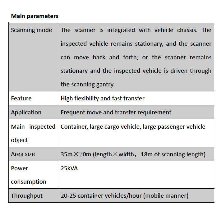 The scanner is integrated with vehicle chassis. The inspected vehicle remains stationary, and the scanner can move back and forth; or the scanner remains stationary and the inspected vehicle is driven through the scanning gantry.