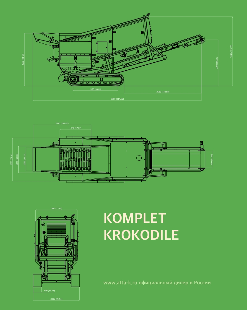 Шредер KOMPLET KROKODILE двухвальный, размер камеры 1470х1096 мм, Бункер 3х2м (2,3куб.м), дизель ISUZU 160кВт(220л.с.), водяное охлаждение, расход топлива 24 л/час, производительность 120т/час, вес 14т, пульт дистанционного радиоуправления, два варианта валов для переработки твёрдых материалов (с железоотделителем) и для преработки древесины.