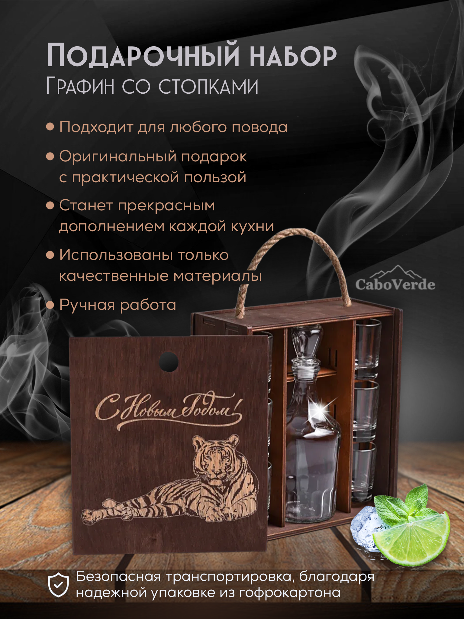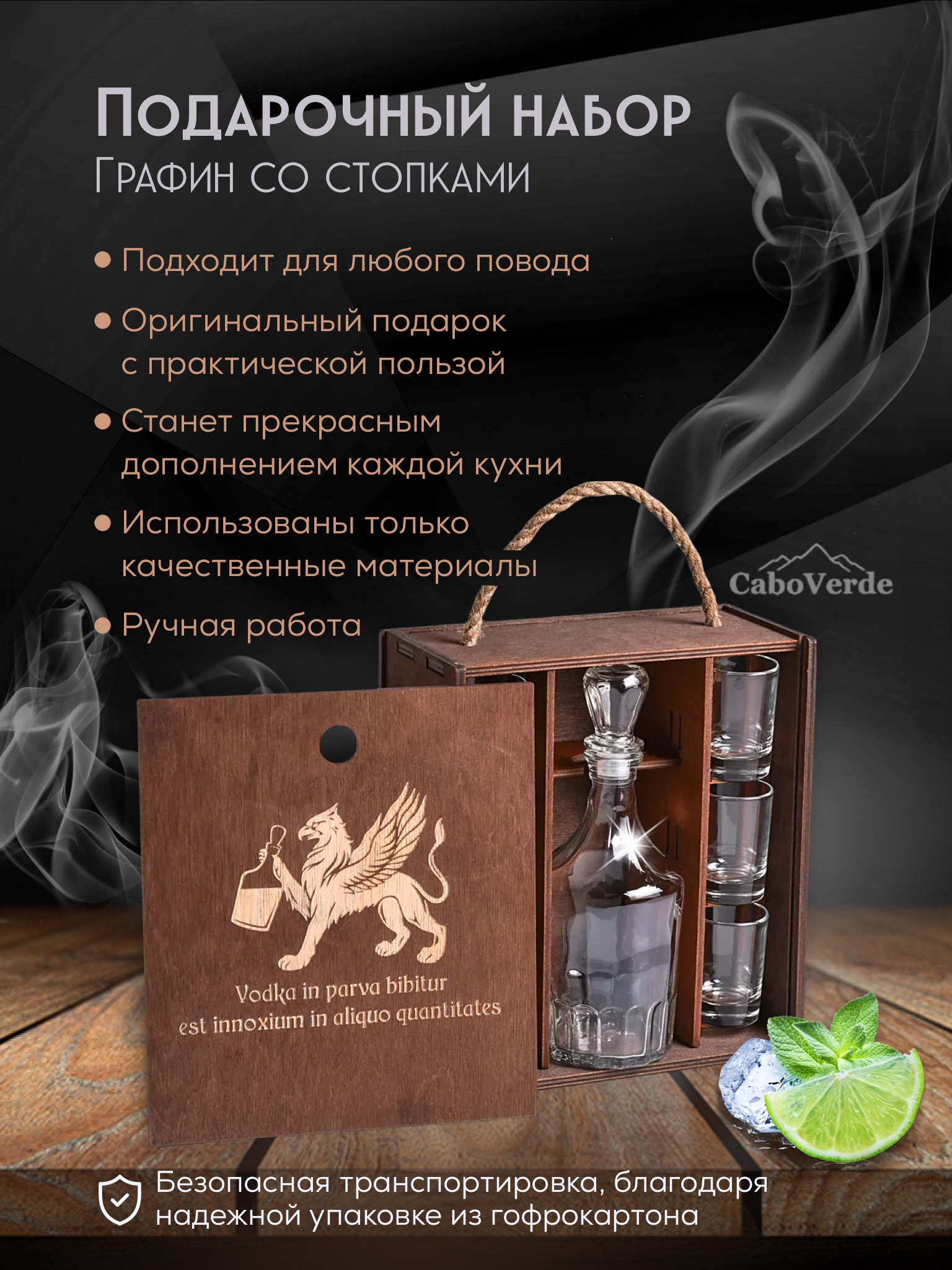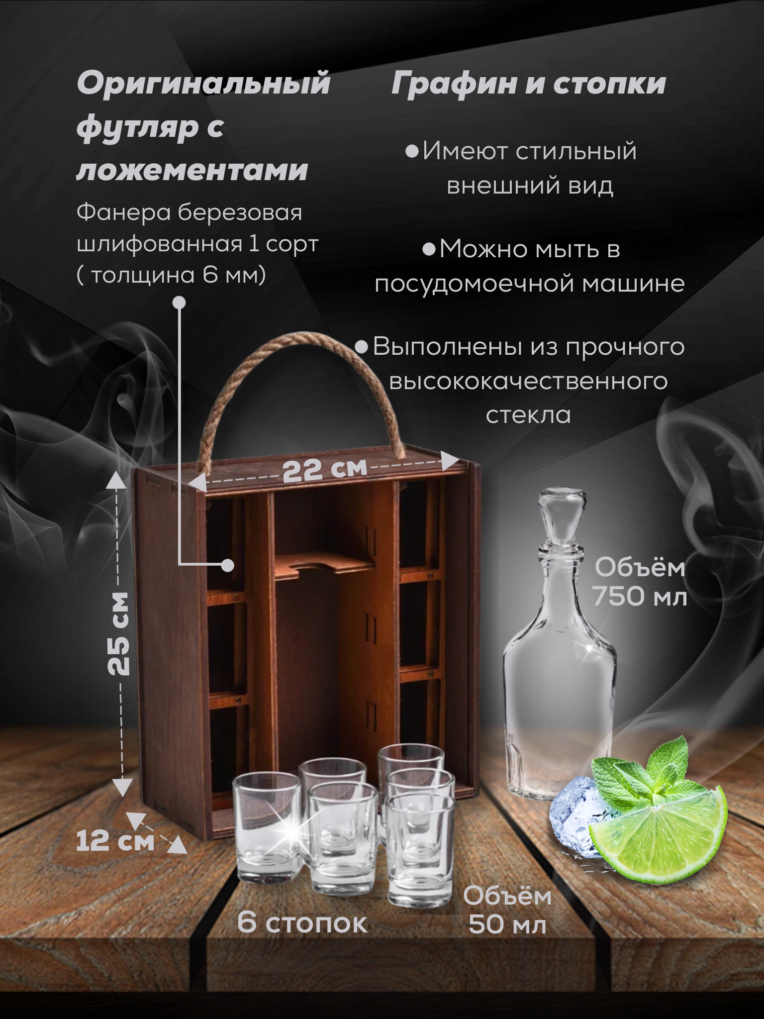Стильный подарочный набор выполнен из высококачественных материалов. Комплект включает в себя стеклянный графин объемом 750 мл, 6 рюмок (объем 50 мл) и оригинальный футляр с ложементами. Для производства футляра используется березовая шлифованная фанера 1 сорта толщиной 6 мм. Габаритные размеры: 25*22*12 см.