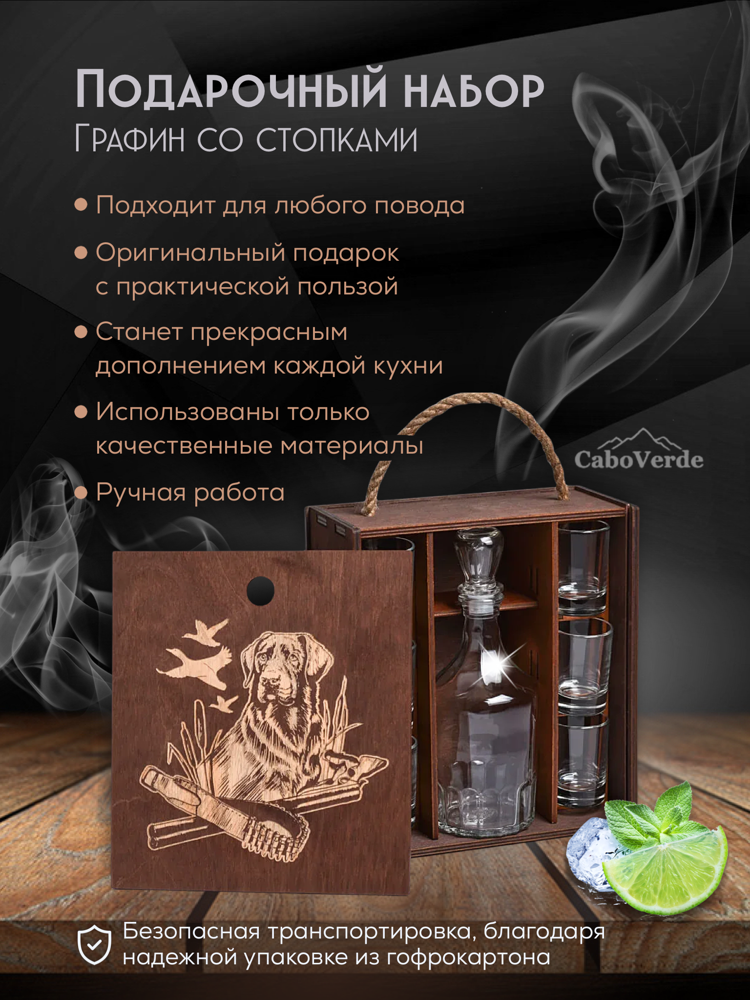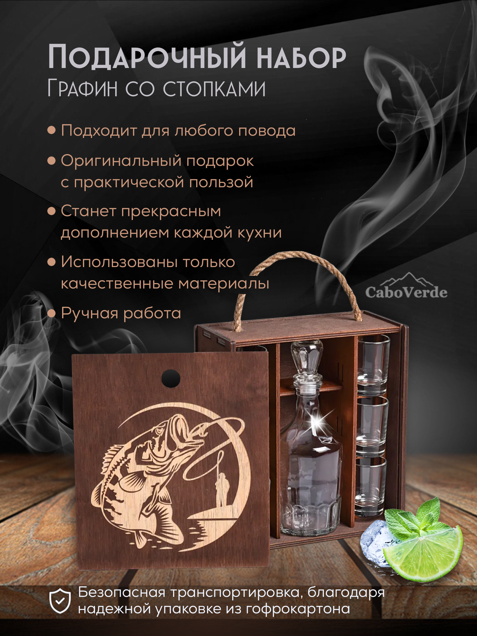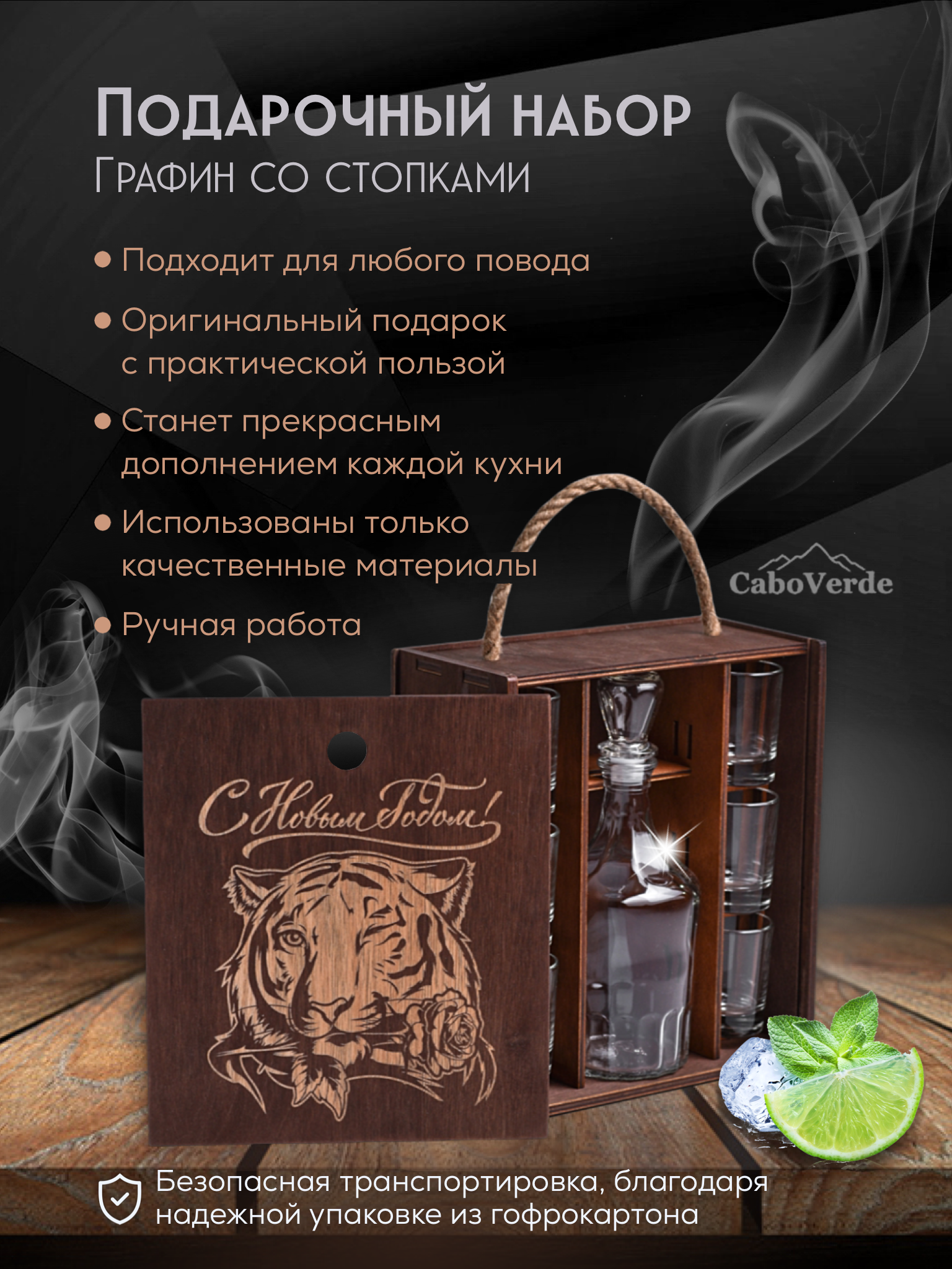 Стильный подарочный набор выполнен из высококачественных материалов. Комплект включает в себя стеклянный графин объемом 750 мл, 6 рюмок (объем 50 мл) и оригинальный футляр с ложементами. Для производства футляра используется березовая шлифованная фанера 1 сорта толщиной 6 мм. Габаритные размеры: 25*22*12 см.