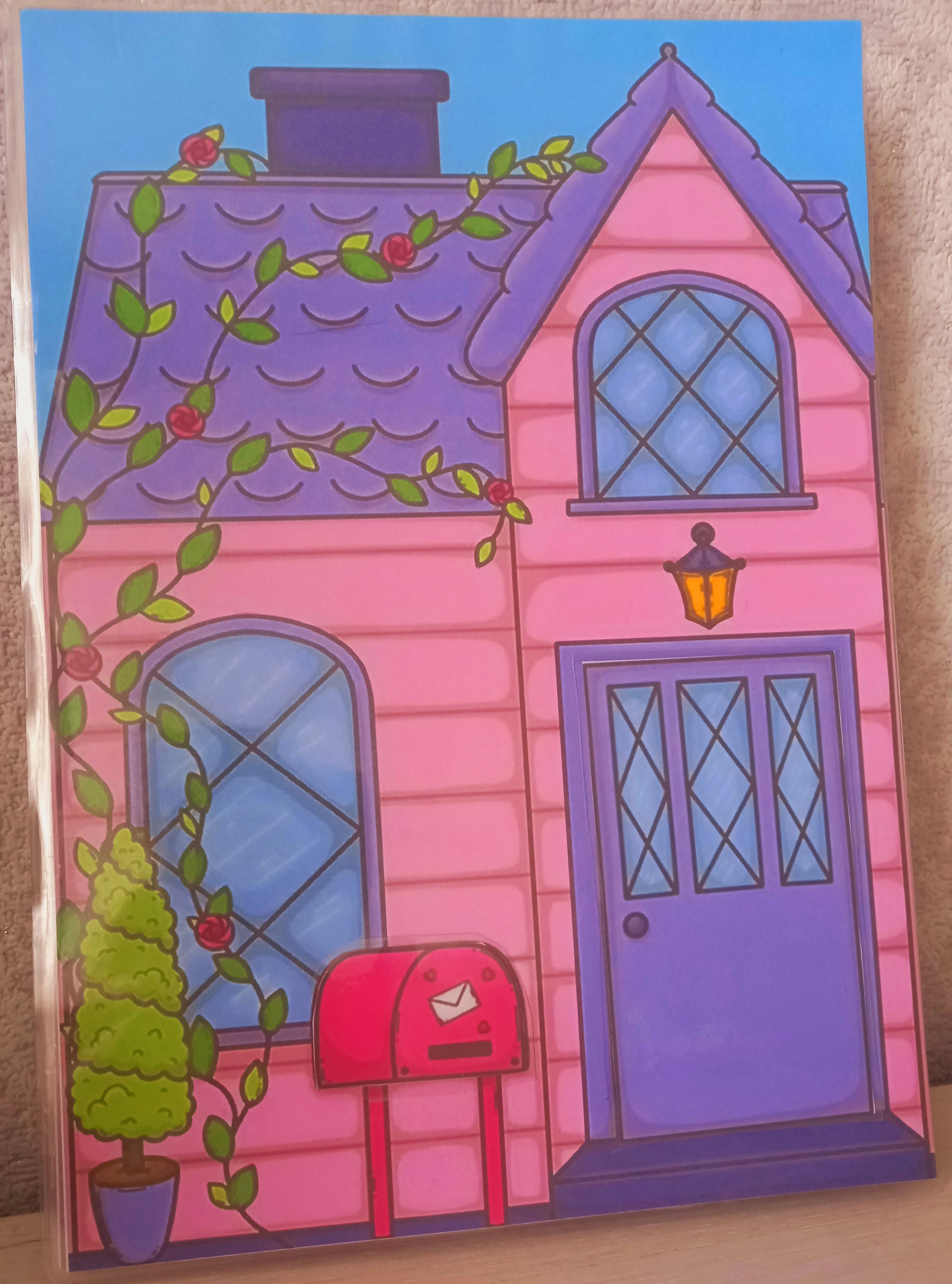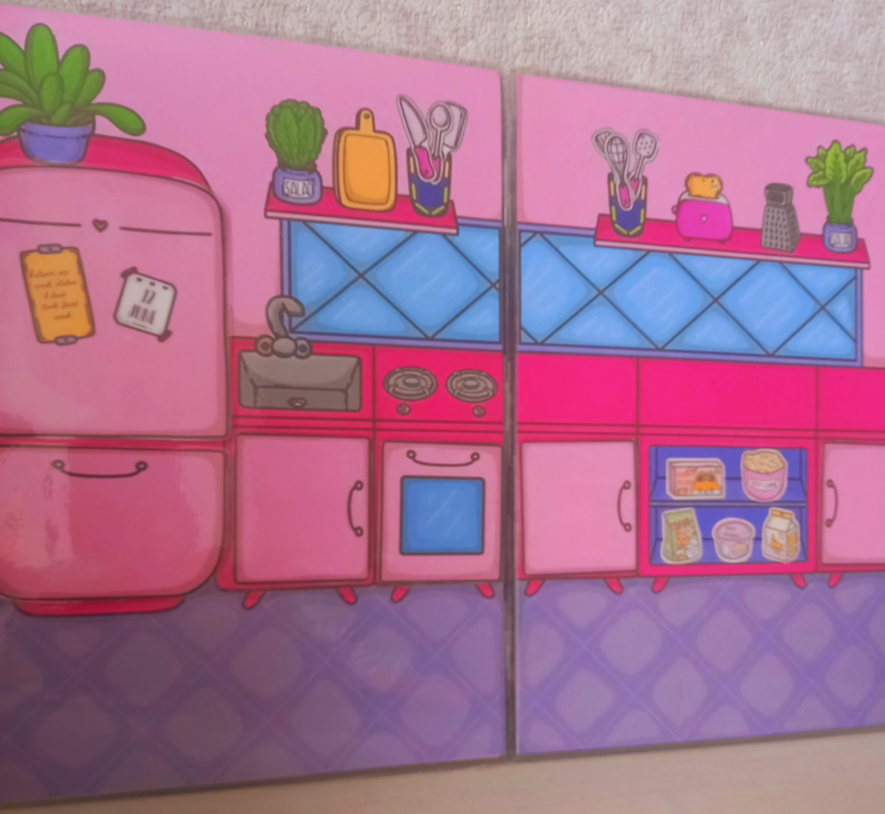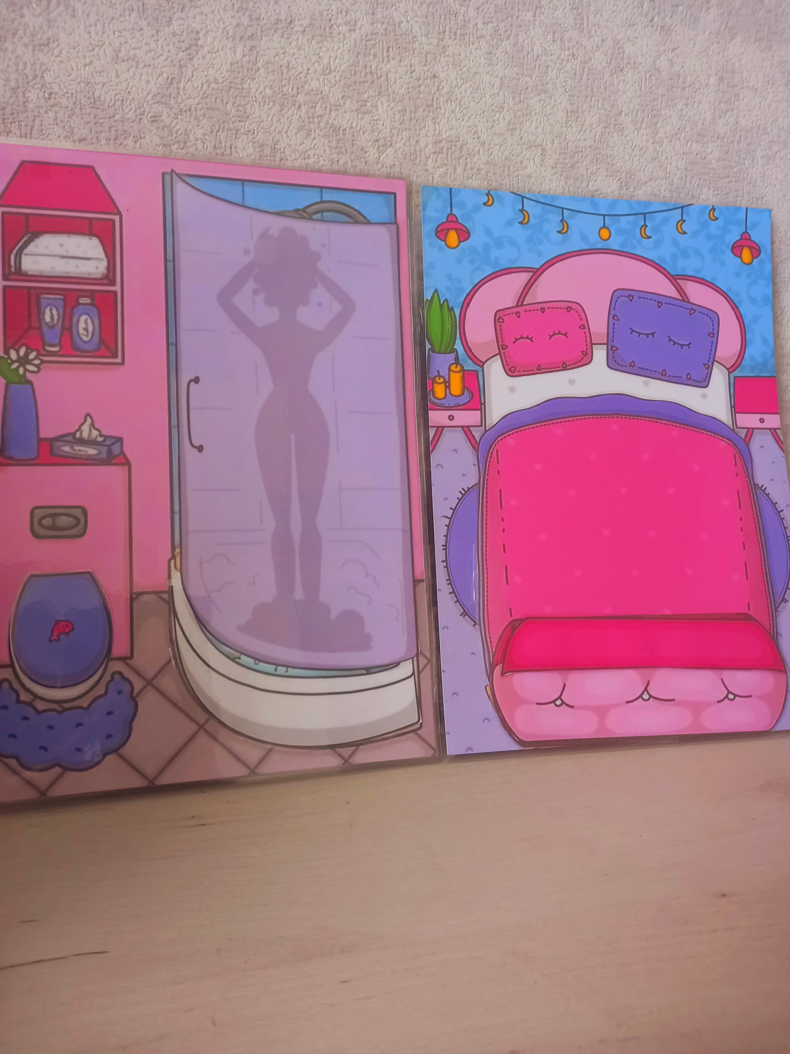 В коробке Вы найдете: книжку домик формата А4 и двух бумажных кукол, готовых к приключениям в семи разных локациях, продуманных до мелочей: гардеробной, гостиной, спальне, кухне, душевой, а также в комнате для творчества.