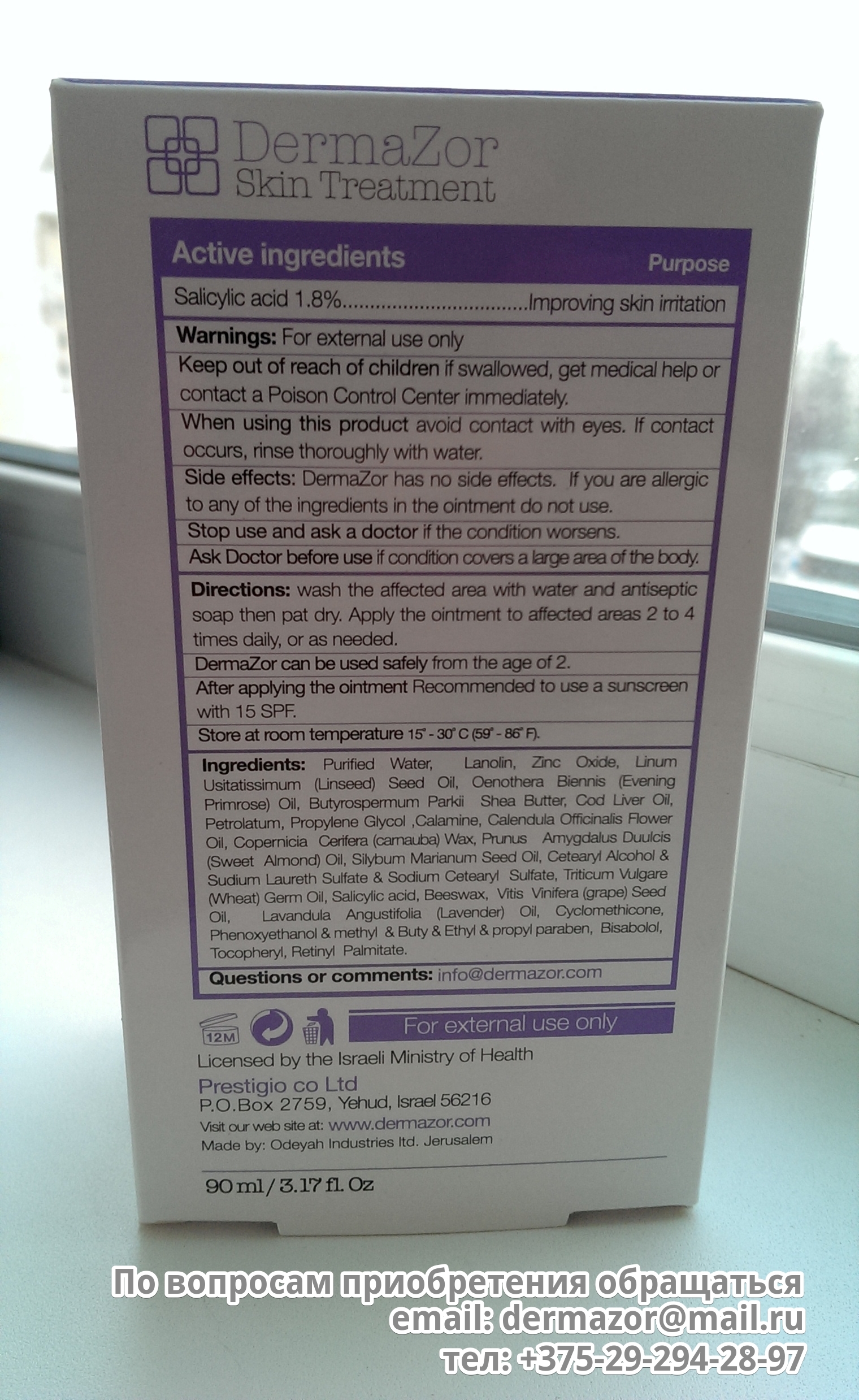 Компания ООО «Дермазор»(Р.Б, г. Минск) реализовывает оптом по низкой цене уникальный крем от псориаза Dermazor, производства Израиль. Только опт от 10 штук. Наша компания является представителем производителя крема на территории СНГ. Компания имеет все документы и разрешения, допуски, тесты для реализации продукта во всём СНГ, заинтересованным лицам мы предоставим все необходимые документы. Крем DermaZor – уникальный прорыв в лечении Псориаза. DermaZor – единственный препарат во всем мире для лечения умеренной и тяжелой форм псориаза без побочных эффектов, для использования на любых участках тела, включая интимные зоны, а также без возрастного ограничения. Исключение составляют дети до 2-х лет. Это натуральный крем, содержащий медицинское сырье, салициловую кислоту, цинк, экстракты растений и органические масла. Продукт имеет Лицензию Европейского союза , признан Всемирной организацией по борьбе с Псориазом, одобрен Министерством здравоохранения Израиля, клинически одобрен дерматологами для применения на гипоаллергенной и чувствительной коже. Регистрация товарного знака в Израиле, в США (Косметические и медицинские продукты), в Европейском союзе и Европейском сообществе. Декларация о соответствии Таможенного Союза Протокол испытаний института метрологии Беларуси Протокол испытаний Минского городского центра гигиены и эпидемиологии. Количество ограничено! Реализация оптовой партии остатка. По вопросам реализации обращаться по указанным контактам.