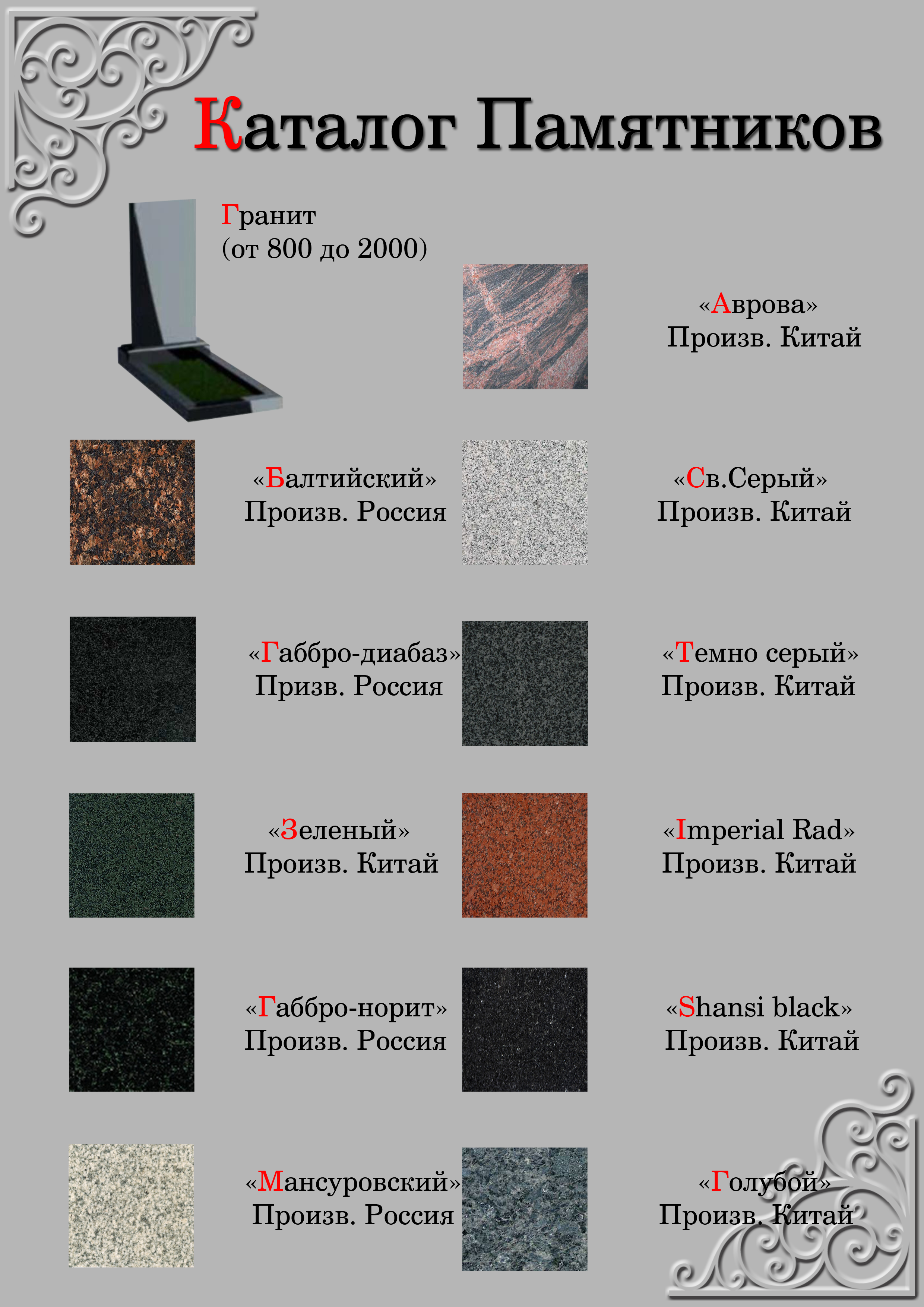 Стелы от (600*400*60) ; тумбы от (500*150*100); цветники от (1000*80*50)