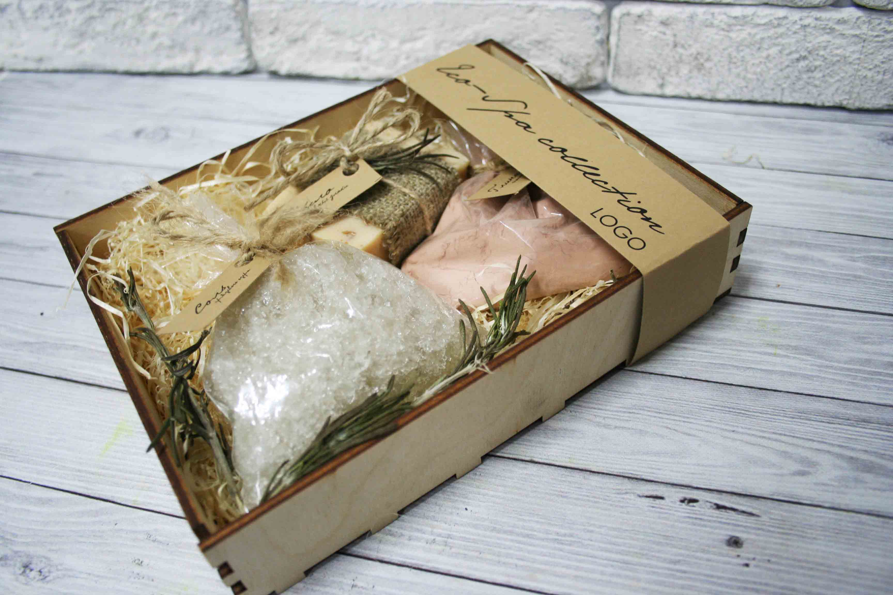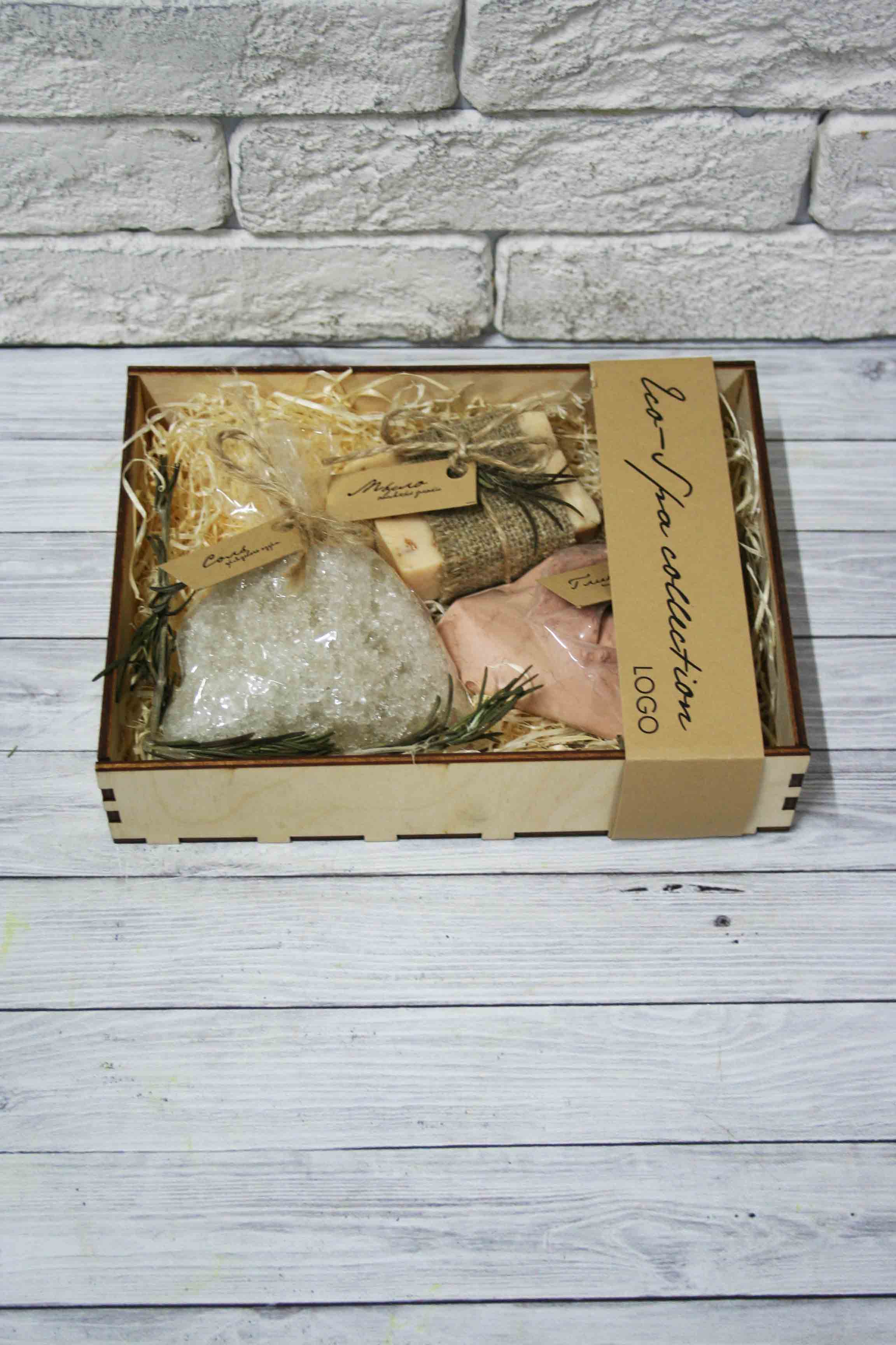 ртикул— cor5 Габаритные размеры: 250х150х45 мм. Материал – белая берёза; Цвет — в ассортименте; Способ нанесение логотипа – цифровая печать; Состав набора: Соль грязевого озера для ванны 150 гр, глина косметическая 150 гр, натуральное мыло с овсяными хлопьями.