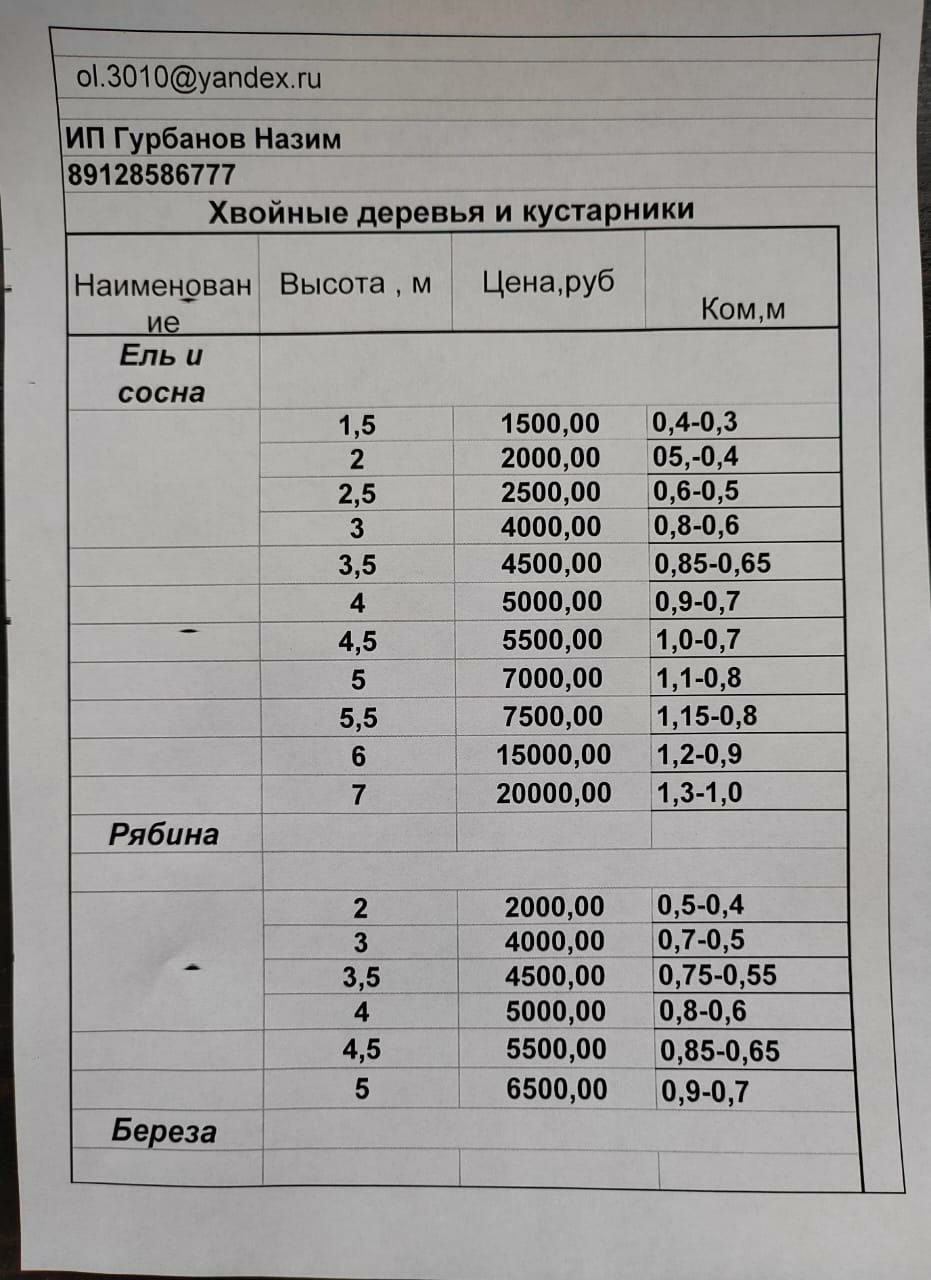 – высота деревьев и стоимость указаны в прикрепленном файле под описанием товара;