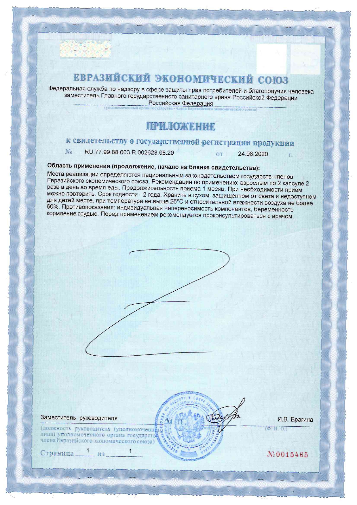 СПОСОБ ПРИМЕНЕНИЯ: взрослым по 2 капсулы 2 раза в день во время еды. Продолжительность приёма — 1 месяц. При необходимости приём можно повторить.